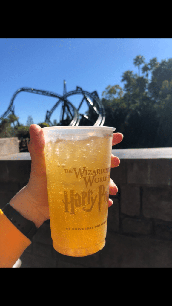 The best locations to get wizard snacks and drinks are if in Diagon Alley go the Hoping pot for all 3 of butter beers 🍻 pumpkin juices butterbeer ice cream other drinks like fizzing Peachtree Fizzing Tea Fishy Green Ale Otter’s Fizzy Orange Juice Tongue Tying Lemon And more these all non alcoholic drinks but you can purchase alcohol drinks must be 21 with ID