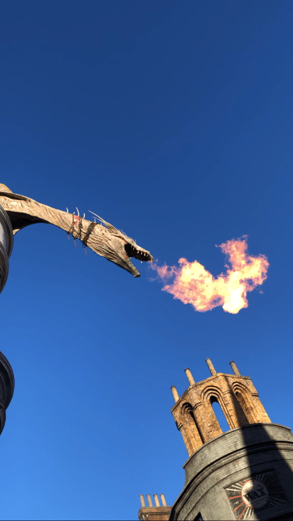 Ride escape from Gringotts it’s such a fun ride and I don’t think you will regret it if you’re a Potter fan or not even if it’s a long wait time it’ such a detail line you won’t get bored if you have done rides like revenge of the mummy spider man Hagrids Transformers and Simpsons you can definitely handle this ride even if you are a bit nervous I don’t think you will regrets going on it’s so magical if you get scared you can always close your eyes or look down! If you don’t want to ride still recommend asking a worker for a Tour inside the bank! Make sure you don’t miss out on the dragon breathing fire 🔥!